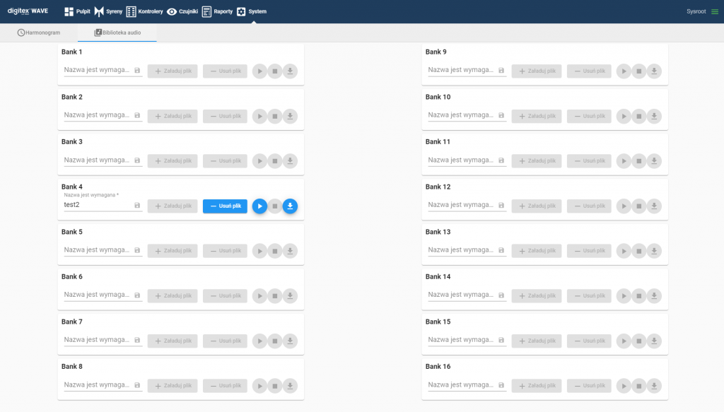 Nowa zakładka BIBLIOTEKA AUDIO umożliwia wygodne zarządzanie całym zbiorem banków audio w systemie. Użytkownik oprogramowania digitexWAVE ma możliwość wgrania do 16 różnych plików audio bezpośrednio na serwer, a następnie uruchomienia ich na syrenie lub grupie syren.